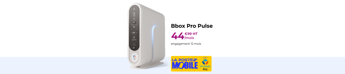 BBOX PRO PULSE : Offre proposée par La Poste Telecom en partenariat avec Bouygues Telecom et opérée par Keyyo, filiale du groupe Bouygues Telecom. Offre valable pour tout professionnel situé en France métropolitaine et éligible aux technologies concernées.